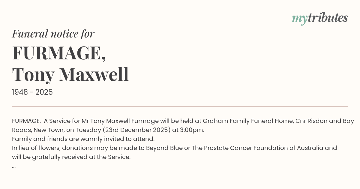 12°CFURMAGE. A Service for Mr Tony Maxwell Furmage will be held at Graham Family Funeral Home, Cnr Risdon and Bay Roads, New Town, on Tuesday (23rd December 2025) at 3:00pm.