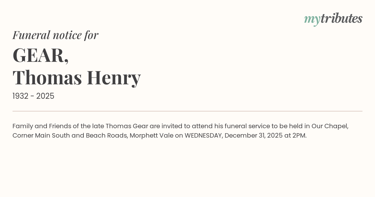 12°CFamily and Friends of the late Thomas Gear are invited to attend his funeral service to be held in Our Chapel, Corner Main South and Beach Roads, Morphett Vale on WEDNESDAY, December 31, 2025 at 2PM.