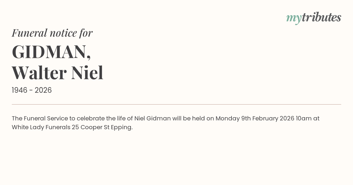 12°CThe Funeral Service to celebrate the life of Niel Gidman will be held on Monday 9th February 2026 10am at White Lady Funerals 25 Cooper St Epping.