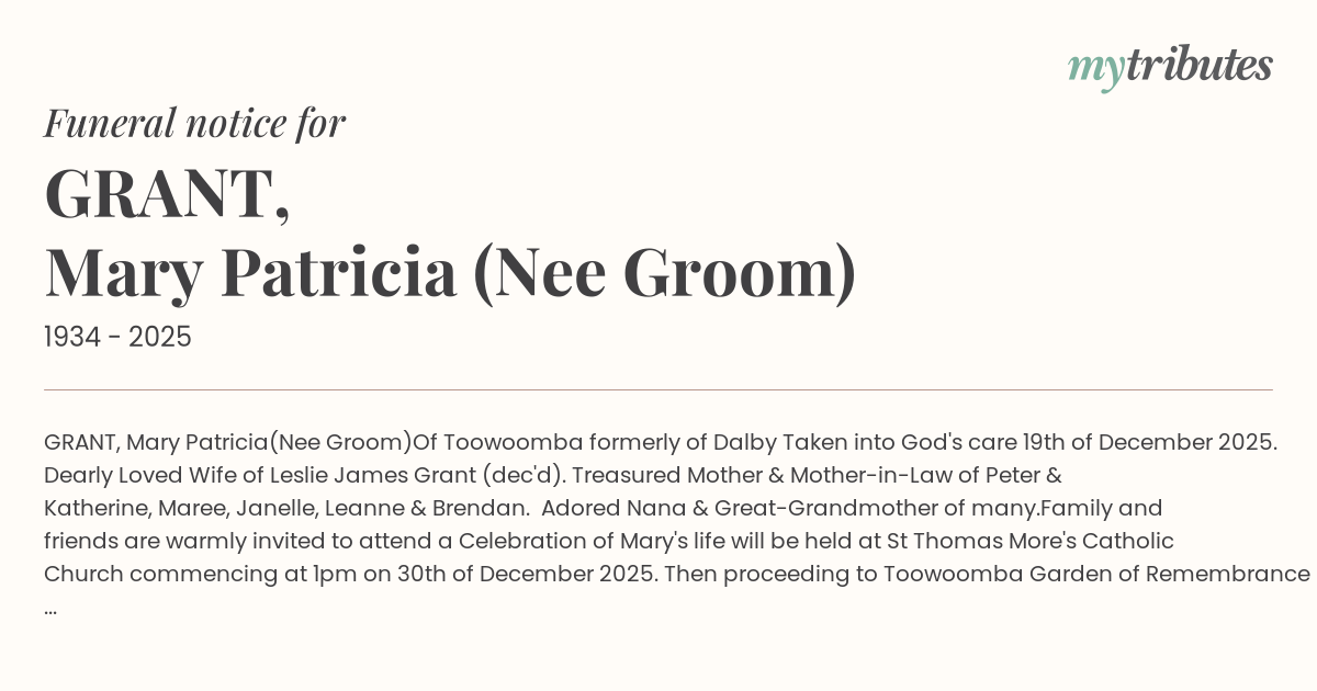 Family and friends are warmly invited to attend a Celebration of Mary's life will be held at St Thomas More's Catholic Church commencing at 1pm on 30th of December 2025. Then proceeding to Toowoomba Garden of Remembrance Cemetery.
