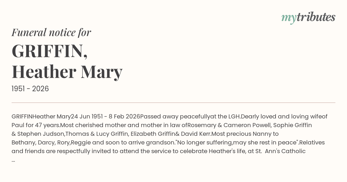 Relatives and friends are respectfully invited to attend the service to celebrate Heather's life, at St. Ann's Catholic Church, Lilydale on Tuesday 17th February, 2026, commencing at 11 am.