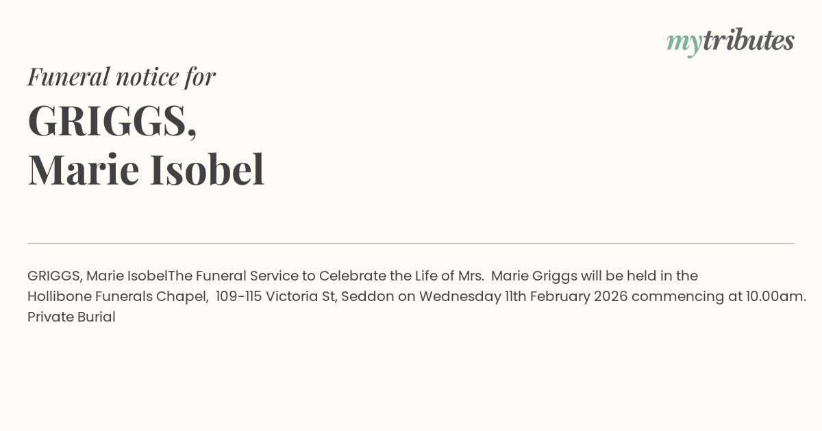 to Celebrate the Life of Mrs. Marie Griggs will be held in the Hollibone Funerals Chapel, 109-115 Victoria St, Seddon on Wednesday 11th February 2026 commencing at 10.00am.
