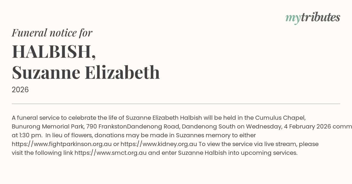 12°CA funeral service to celebrate the life of Suzanne Elizabeth Halbish will be held in the Cumulus Chapel, Bunurong Memorial Park, 790 Frankston–Dandenong Road, Dandenong South on Wednesday, 4 February 2026 commencing at 1:30 pm.