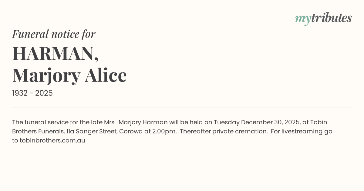 12°CThe funeral service for the late Mrs. Marjory Harman will be held on Tuesday December 30, 2025, at Tobin Brothers Funerals, 11a Sanger Street, Corowa at 2.00pm. Thereafter private cremation.