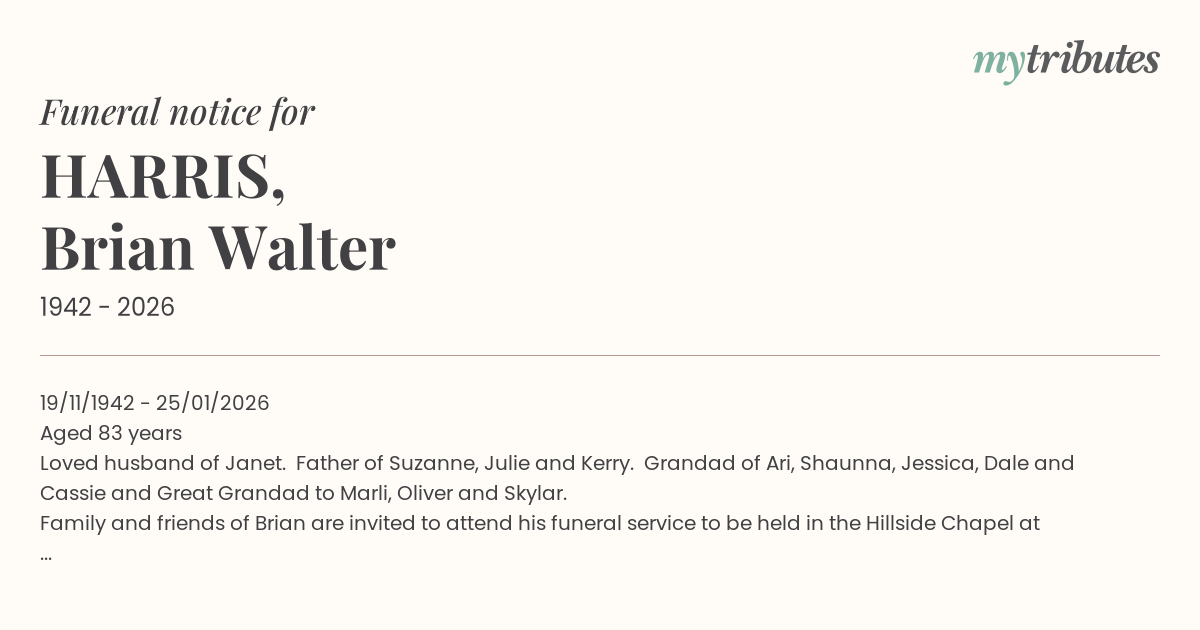 Family and friends of Brian are invited to attend his funeral service to be held in the Hillside Chapel at Palmdale Lawn Cemetery & Memorial Park, 51 Palmdale Road, Palmdale, on Wednesday 04 February 2026, commencing at 10.30 am. n lieu of flowers please consider making a donation to Motor Neurone Disease NSW.