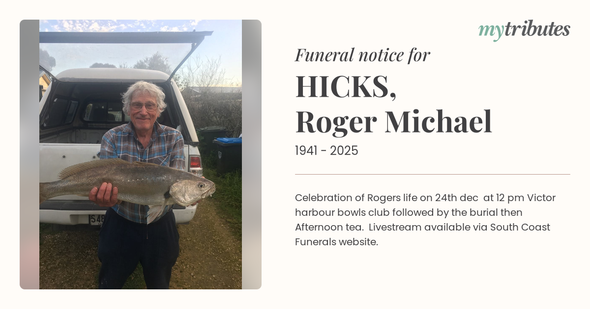 12°CCelebration of Rogers life on 24th dec at 12 pm Victor harbour bowls club followed by the burial then Afternoon tea. Livestream available via South Coast Funerals website.