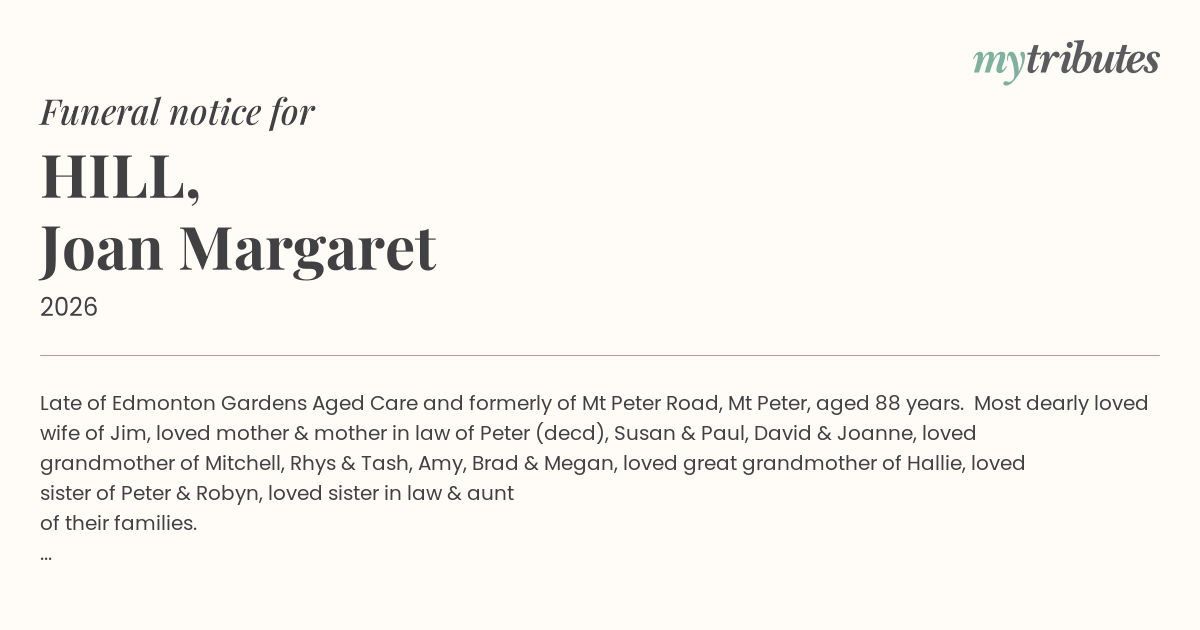 12°CLate of Edmonton Gardens Aged Care and formerly of Mt Peter Road, Mt Peter, aged 88 years. Most dearly loved wife of Jim, loved mother & mother in law of Peter (dec’d), Susan & Paul, David & Joanne, loved grandmother of Mitchell, Rhys & Tash, Amy, Brad & Megan, loved great grandmother of Hallie, loved sister of Peter & Robyn, loved sister in law & aunt