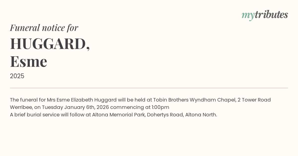 12°CThe funeral for Mrs Esme Elizabeth Huggard will be held at Tobin Brothers Wyndham Chapel, 2 Tower Road Werribee, on Tuesday January 6th, 2026 commencing at 1:00pm
