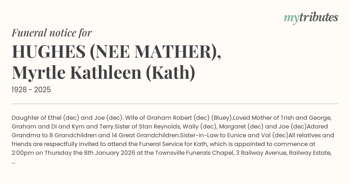 All relatives and friends are respectfully invited to attend the Funeral Service for Kath, which is appointed to commence at 2:00pm on Thursday the 8th January 2026 at the Townsville Funerals Chapel, 3 Railway Avenue, Railway Estate, 4810