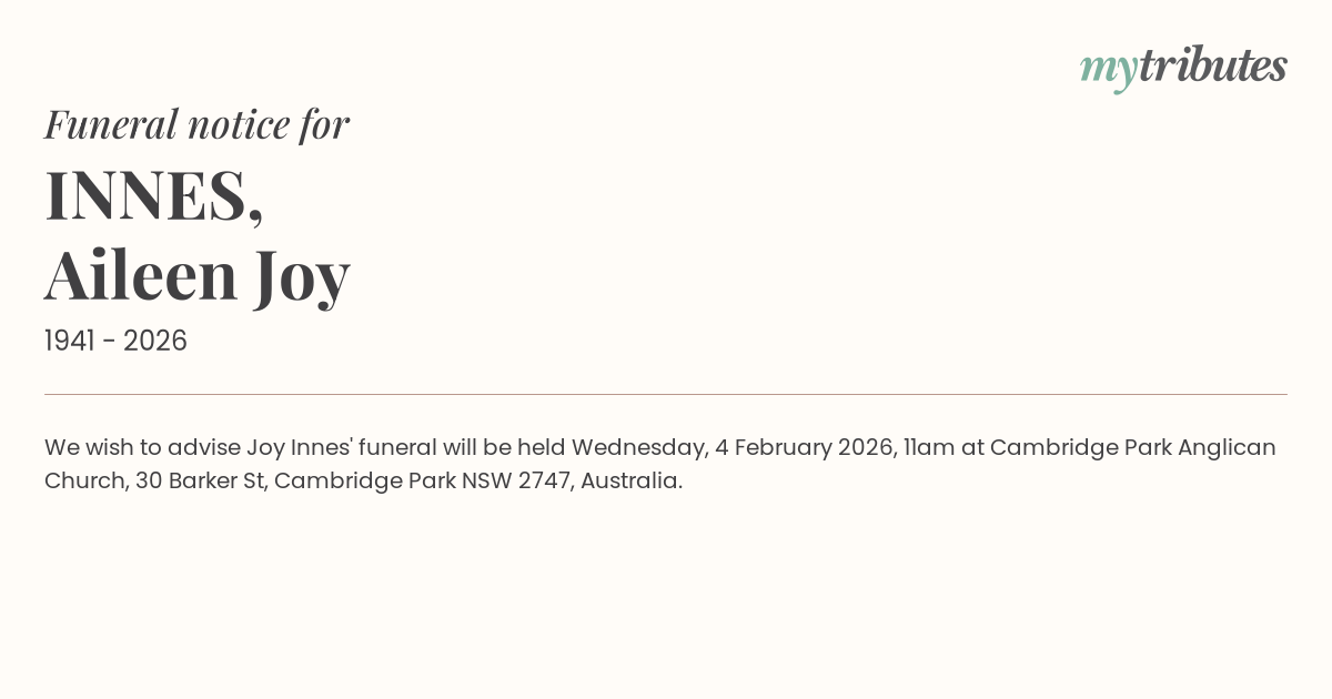 12°CWe wish to advise Joy Innes' funeral will be held Wednesday, 4 February 2026, 11am at Cambridge Park Anglican Church, 30 Barker St, Cambridge Park NSW 2747, Australia.