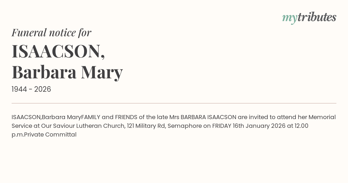 FAMILY and FRIENDS of the late Mrs BARBARA ISAACSON are invited to attend her Memorial Service at Our Saviour Lutheran Church, 121 Military Rd, Semaphore on FRIDAY 16th January 2026 at 12.00 p.m.