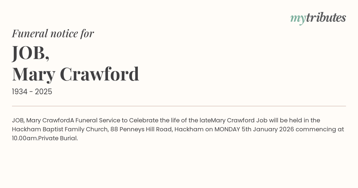 Mary Crawford Job will be held in the Hackham Baptist Family Church, 88 Penneys Hill Road, Hackham on MONDAY 5th January 2026 commencing at 10.00am.
