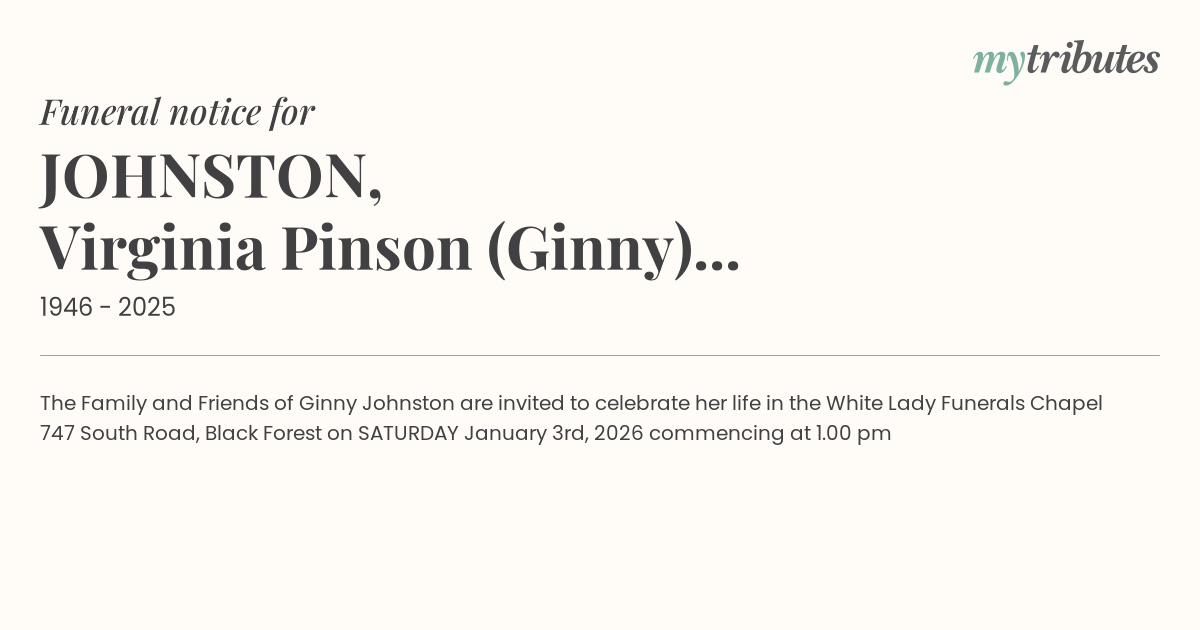 12°CThe Family and Friends of Ginny Johnston are invited to celebrate her life in the White Lady Funerals Chapel 747 South Road, Black Forest on SATURDAY January 3rd, 2026 commencing at 1.00 pm