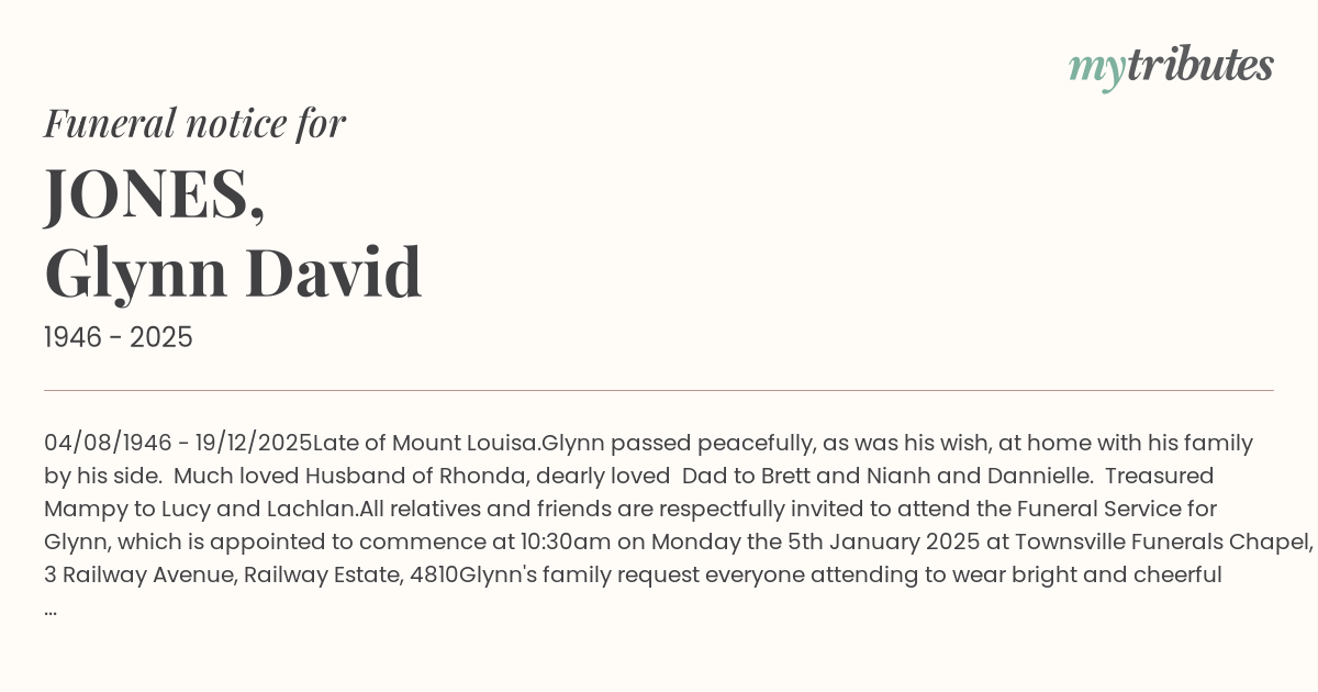 All relatives and friends are respectfully invited to attend the Funeral Service for Glynn, which is appointed to commence at 10:30am on Monday the 5th January 2025 at Townsville Funerals Chapel, 3 Railway Avenue, Railway Estate, 4810