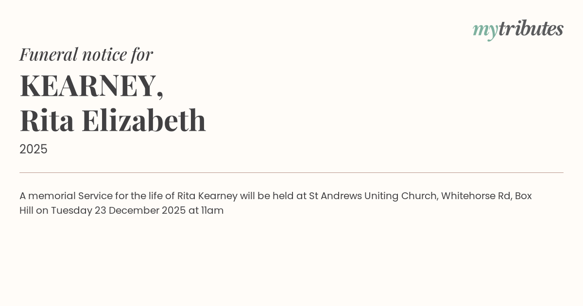 12°CA memorial Service for the life of Rita Kearney will be held at St Andrews Uniting Church, Whitehorse Rd, Box Hill on Tuesday 23 December 2025 at 11am
