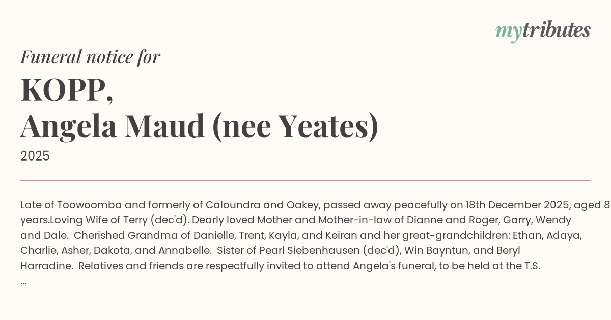 Relatives and friends are respectfully invited to attend Angela's funeral, to be held at the T.S. Burstow Chapel, 1020 Ruthven Street (south), Toowoomba, service commencing at 12:00pm, Tuesday, 6th January 2026.