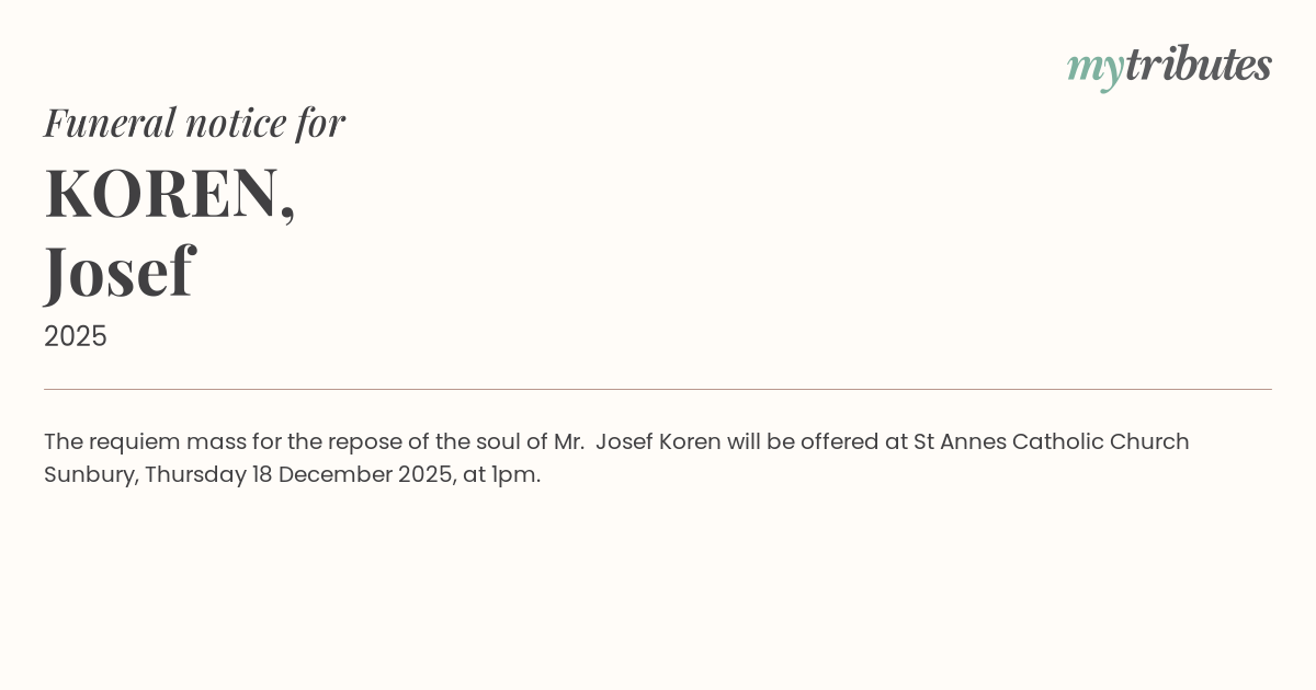 12°CThe requiem mass for the repose of the soul of Mr. Josef Koren will be offered at St Anne’s Catholic Church Sunbury, Thursday 18 December 2025, at 1pm.