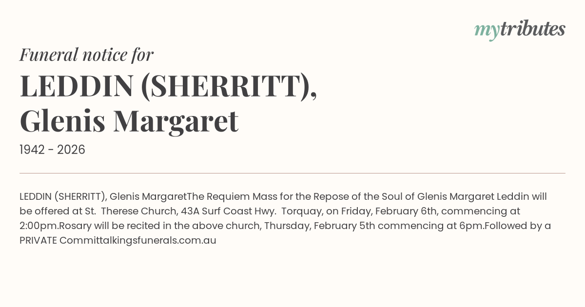 The Requiem Mass for the Repose of the Soul of Glenis Margaret Leddin will be offered at