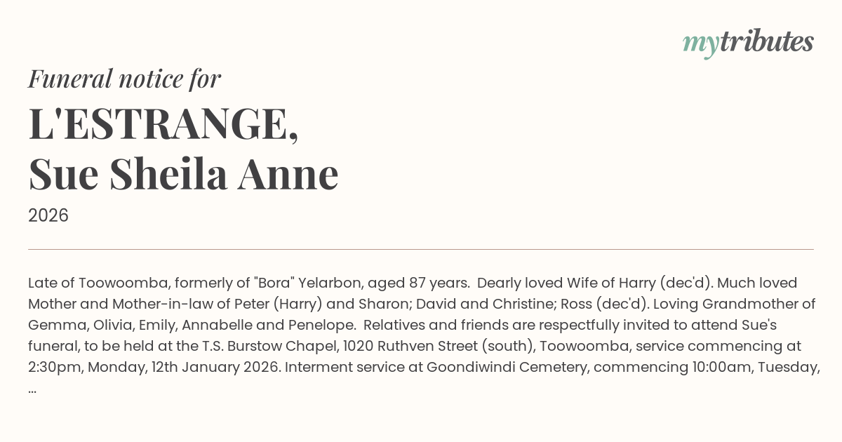 Relatives and friends are respectfully invited to attend Sue's funeral, to be held at the T.S. Burstow Chapel, 1020 Ruthven Street (south), Toowoomba, service commencing at 2:30pm, Monday, 12th January 2026. Interment service at Goondiwindi Cemetery, commencing 10:00am, Tuesday, 13th January 2026.