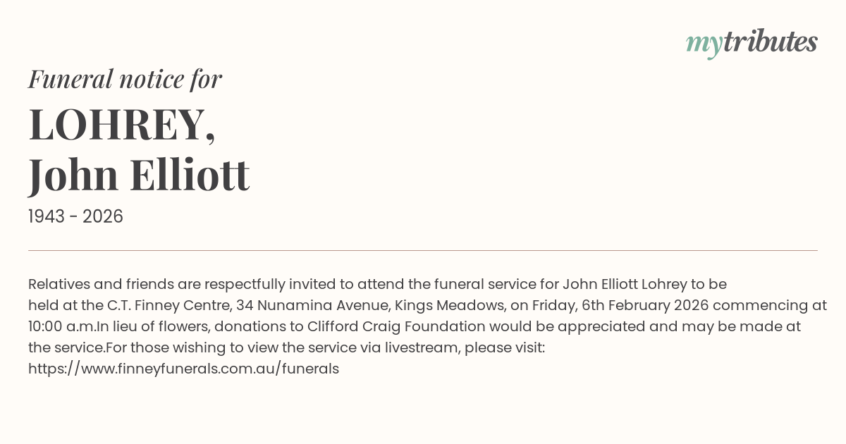 12°CRelatives and friends are respectfully invited to attend the funeral service for John Elliott Lohrey to be held at the C.T. Finney Centre, 34 Nunamina Avenue, Kings Meadows, on Friday, 6th February 2026 commencing at 10:00 a.m.
