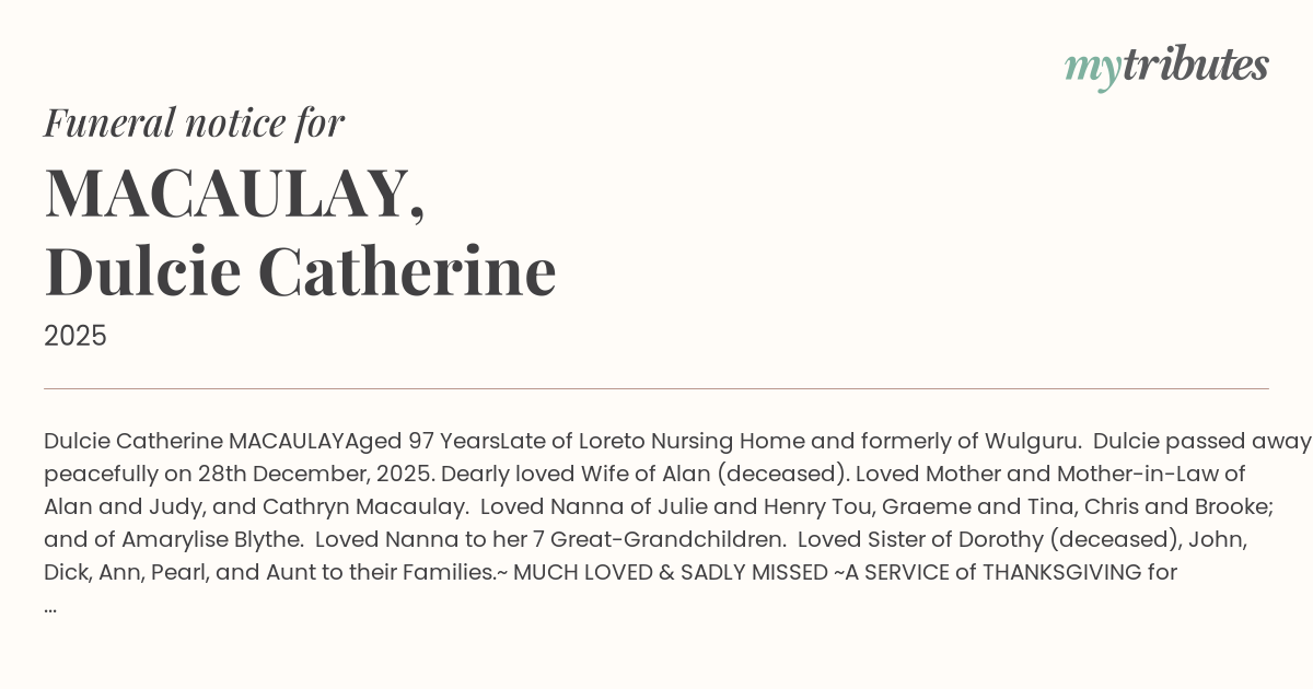 Late of Loreto Nursing Home and formerly of Wulguru. Dulcie passed away peacefully on 28th December, 2025. Dearly loved Wife of Alan (deceased). Loved Mother and Mother-in-Law of Alan and Judy, and Cathryn Macaulay. Loved Nanna of Julie and Henry Tou, Graeme and Tina, Chris and Brooke; and of Amarylise Blythe. Loved Nanna to her 7 Great-Grandchildren. Loved Sister of Dorothy (deceased), John, Dick, Ann, Pearl, and Aunt to their Families.