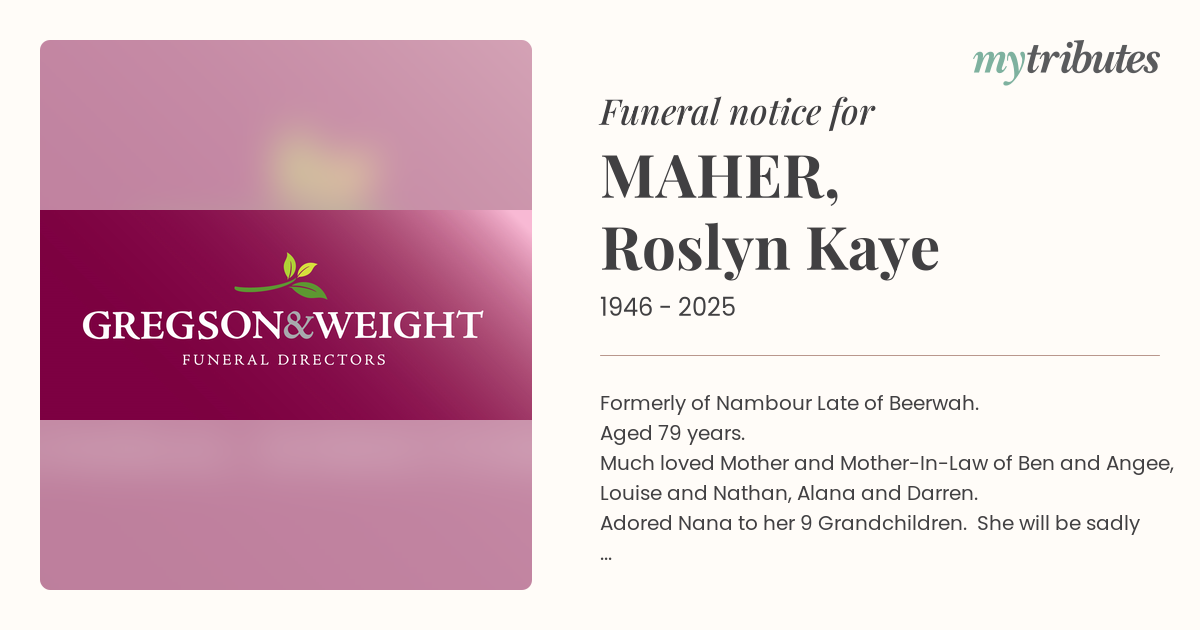 Family and friends are invited to attend the celebration of Ros's life to be held at the Gregson and Weight Chapel, 5 Gregson place Caloundra on Monday 5/1/2026 at 11:00am. Ros would love all friends and family to wear their brightest colours.