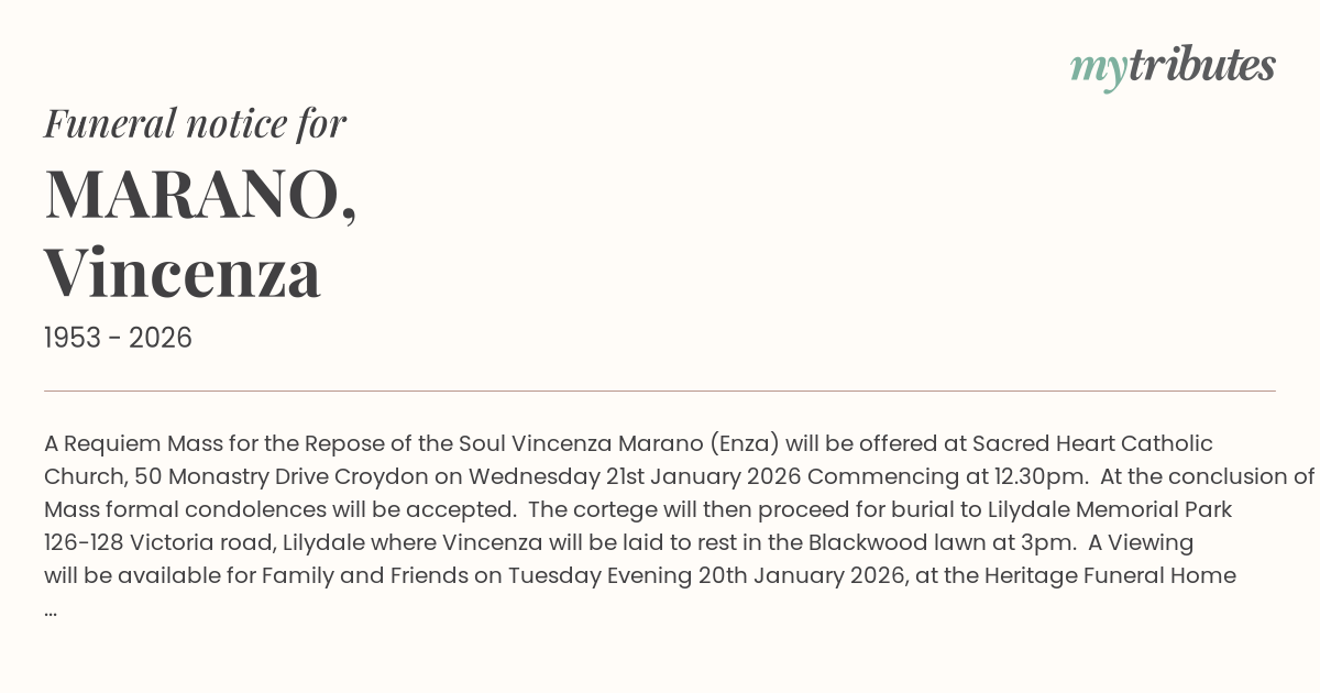 12°CA Requiem Mass for the Repose of the Soul Vincenza Marano (Enza) will be offered at Sacred Heart Catholic Church, 50 Monastry Drive Croydon on Wednesday 21st January 2026 Commencing at 12.30pm. At the conclusion of Mass formal condolences will be accepted. The cortege will then proceed for burial to Lilydale Memorial Park 126-128 Victoria road, Lilydale where Vincenza will be laid to rest in the Blackwood lawn at 3pm. A Viewing will be available for Family and Friends on Tuesday Evening 20th January 2026, at the Heritage Funeral Home 733 Boronia Road, Wantirna Commencing at 6.00pm. Rosary will then be recited at 7.00pm. In lieu of flowers Donations in Memory of Vincenza would be appreciated to your preferred charity. To view the Mass via the livestream please head to https://www.heritagefunerals.com.au/upcoming-services