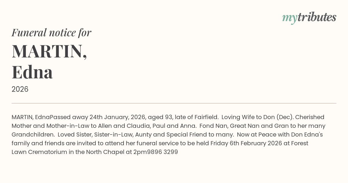 Edna's family and friends are invited to attend her funeral service to be held Friday 6th February 2026 at Forest Lawn Crematorium in the North Chapel at 2pm