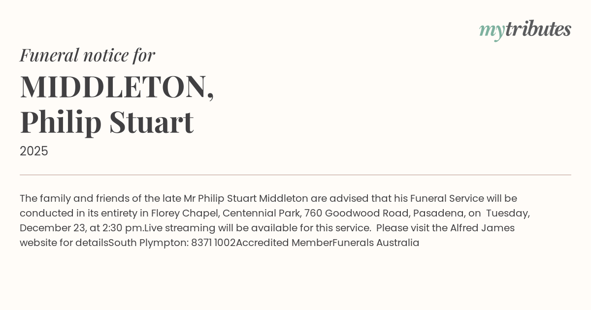 12°CThe family and friends of the late Mr Philip Stuart Middleton are advised that his Funeral Service will be conducted in its entirety in Florey Chapel, Centennial Park, 760 Goodwood Road, Pasadena, on Tuesday, December 23, at 2:30 pm.