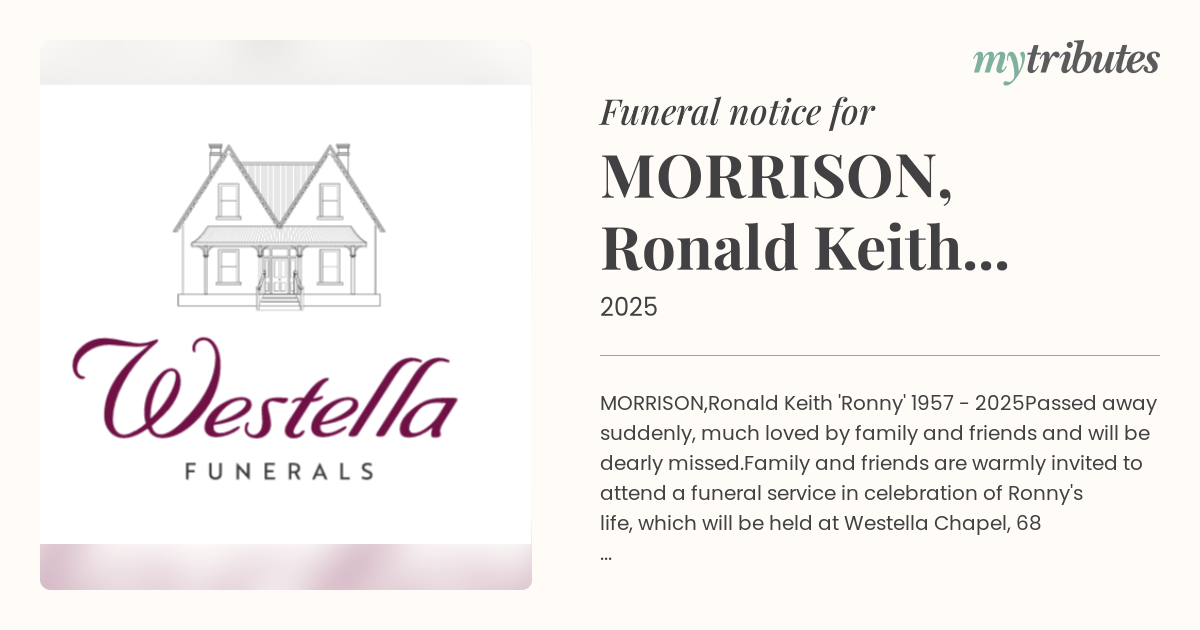 Family and friends are warmly invited to attend a funeral service in celebration of Ronny's life, which will be held at Westella Chapel,