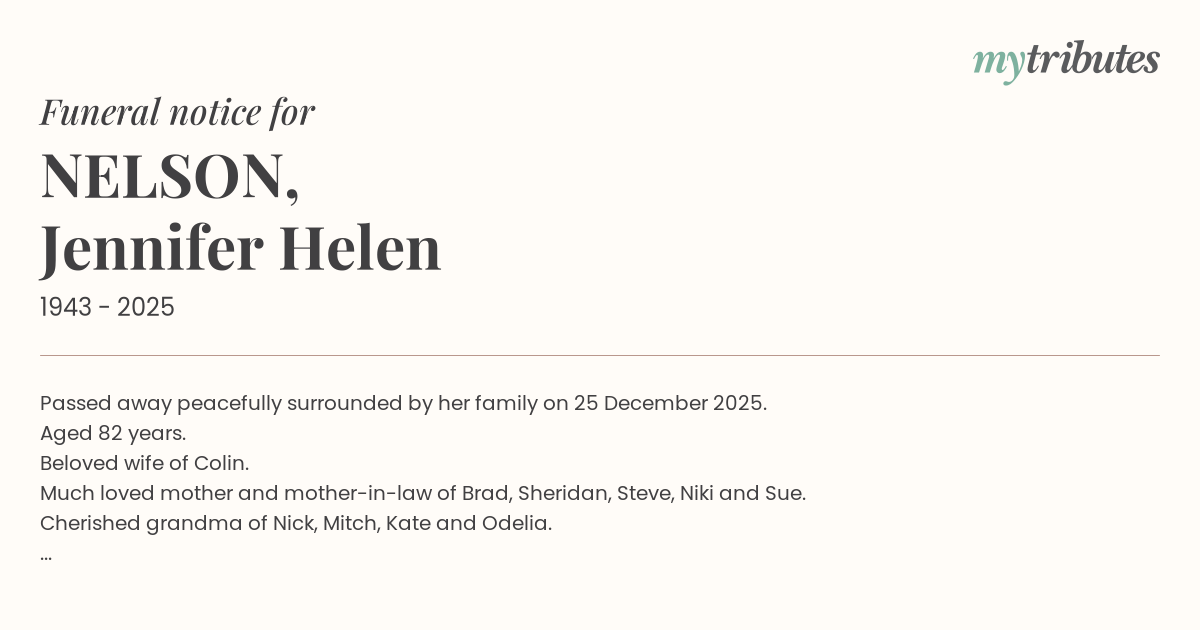 12°CPassed away peacefully surrounded by her family on 25 December 2025.