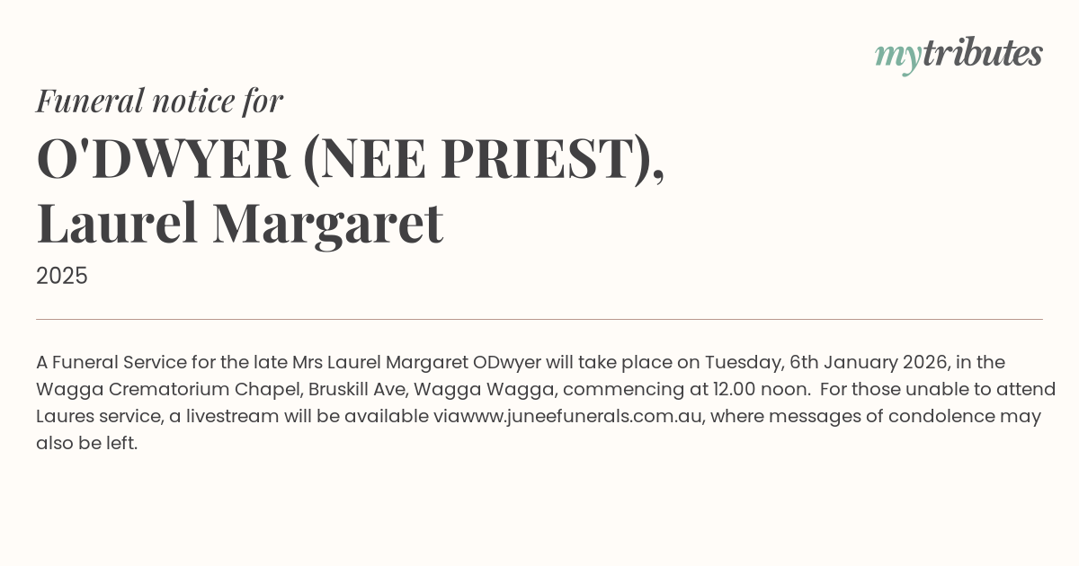 12°CA Funeral Service for the late Mrs Laurel Margaret O’Dwyer will take place on Tuesday, 6th January 2026, in the Wagga Crematorium Chapel, Bruskill Ave, Wagga Wagga, commencing at 12.00 noon.