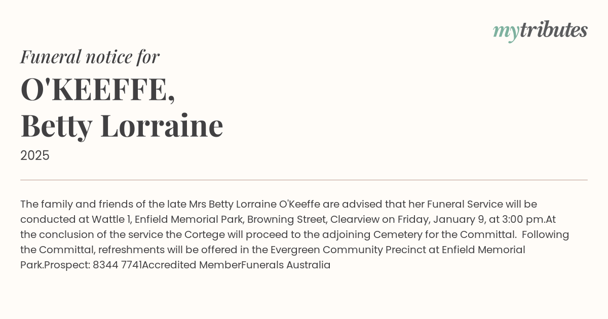 12°CThe family and friends of the late Mrs Betty Lorraine O'Keeffe are advised that her Funeral Service will be conducted at Wattle 1, Enfield Memorial Park, Browning Street, Clearview on Friday, January 9, at 3:00 pm.