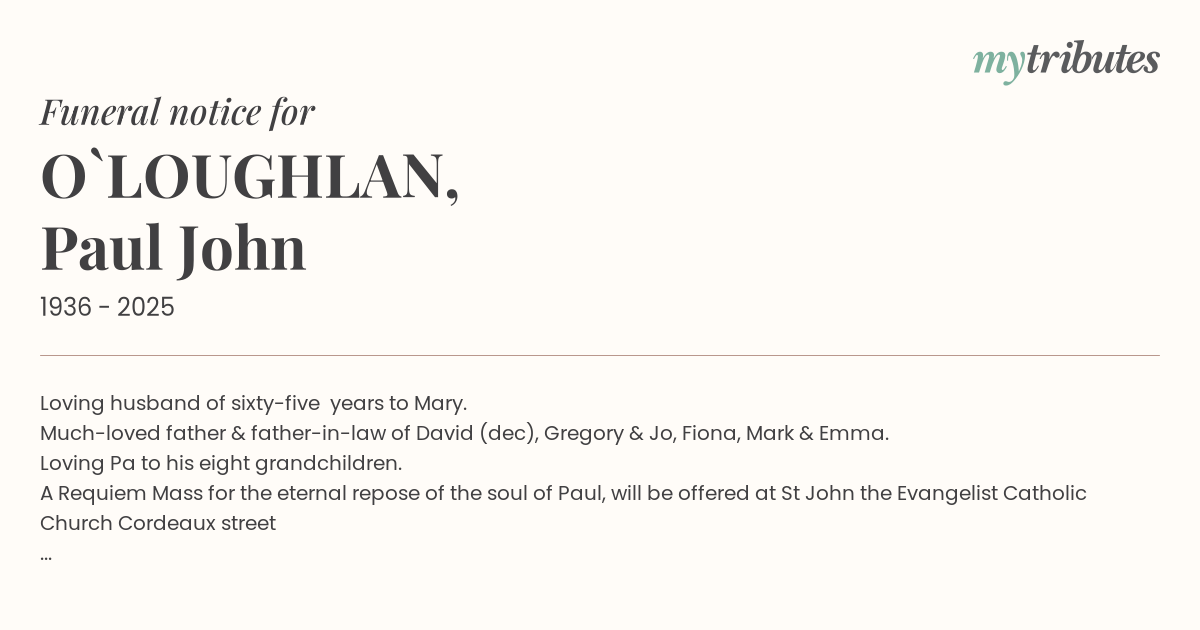 A Requiem Mass for the eternal repose of the soul of Paul, will be offered at St John the Evangelist Catholic Church Cordeaux street