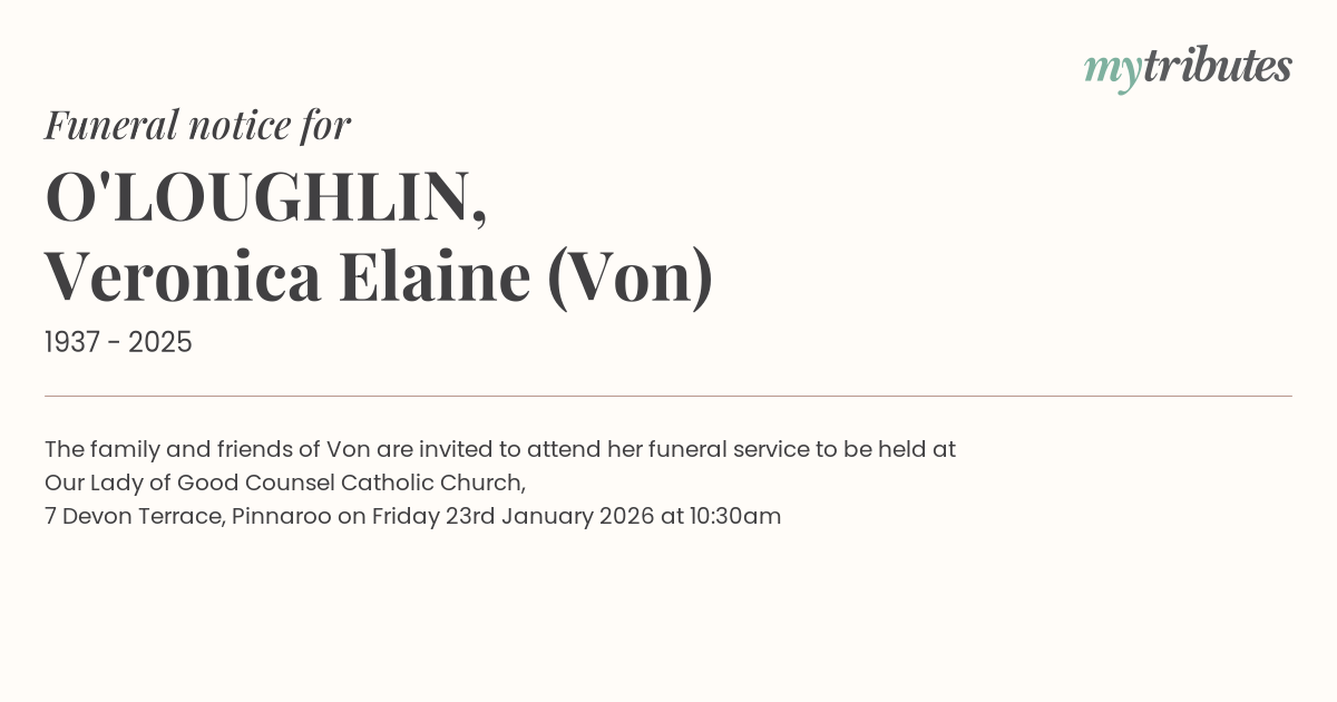 12°CThe family and friends of Von are invited to attend her funeral service to be held at