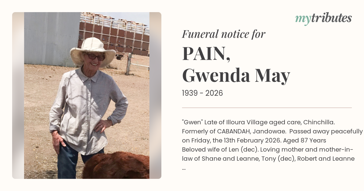 12°C"Gwen" Late of Illoura Village aged care, Chinchilla. Formerly of “CABANDAH”, Jandowae. Passed away peacefully on Friday, the 13th February 2026. Aged 87 Years Beloved wife of Len (dec). Loving mother and mother-in-law of Shane and Leanne, Tony (dec), Robert and Leanne Flynn. Loved Nan-nan of Rebecca, Christina, Mark, Brenton, Ashlee, Lawson, and Laura. Great Nan-nan of Alex, William, Anthony Pain, Anthony Gray, and Amelia. Sister and sister-in-law of Errol and Judy Giesemann. The family and friends of Gwenda are respectfully invited to attend her Life Celebration Graveside Service to be held at the Jandowae Lawn Cemetery, Old Rosevale Rd, Jandowae. The service will commence at 10:30 am on Thursday, the 26th of February 2026. "Reunited with Len, and Tony"
