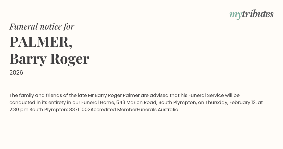 12°CThe family and friends of the late Mr Barry Roger Palmer are advised that his Funeral Service will be conducted in its entirety in our Funeral Home, 543 Marion Road, South Plympton, on Thursday, February 12, at 2:30 pm.