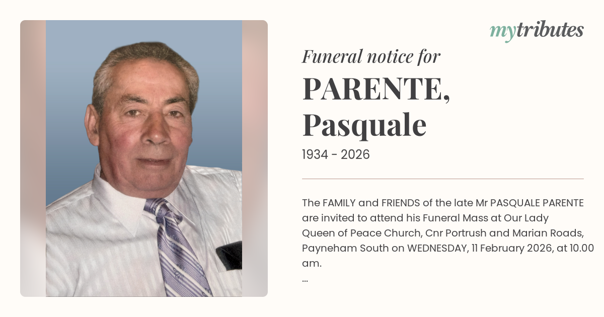 12°CThe FAMILY and FRIENDS of the late Mr PASQUALE PARENTE are invited to attend his Funeral Mass at Our Lady Queen of Peace Church, Cnr Portrush and Marian Roads, Payneham South on WEDNESDAY, 11 February 2026, at 10.00 am.