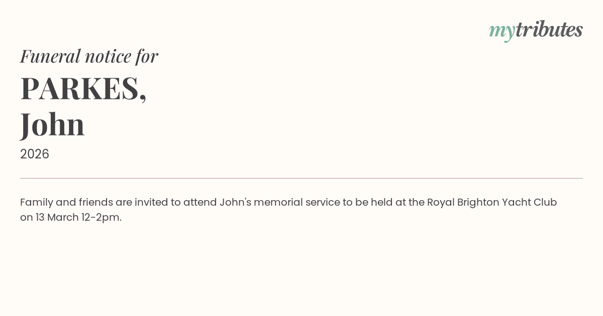 12°CFamily and friends are invited to attend John's memorial service to be held at the Royal Brighton Yacht Club on 13 March 12-2pm.
