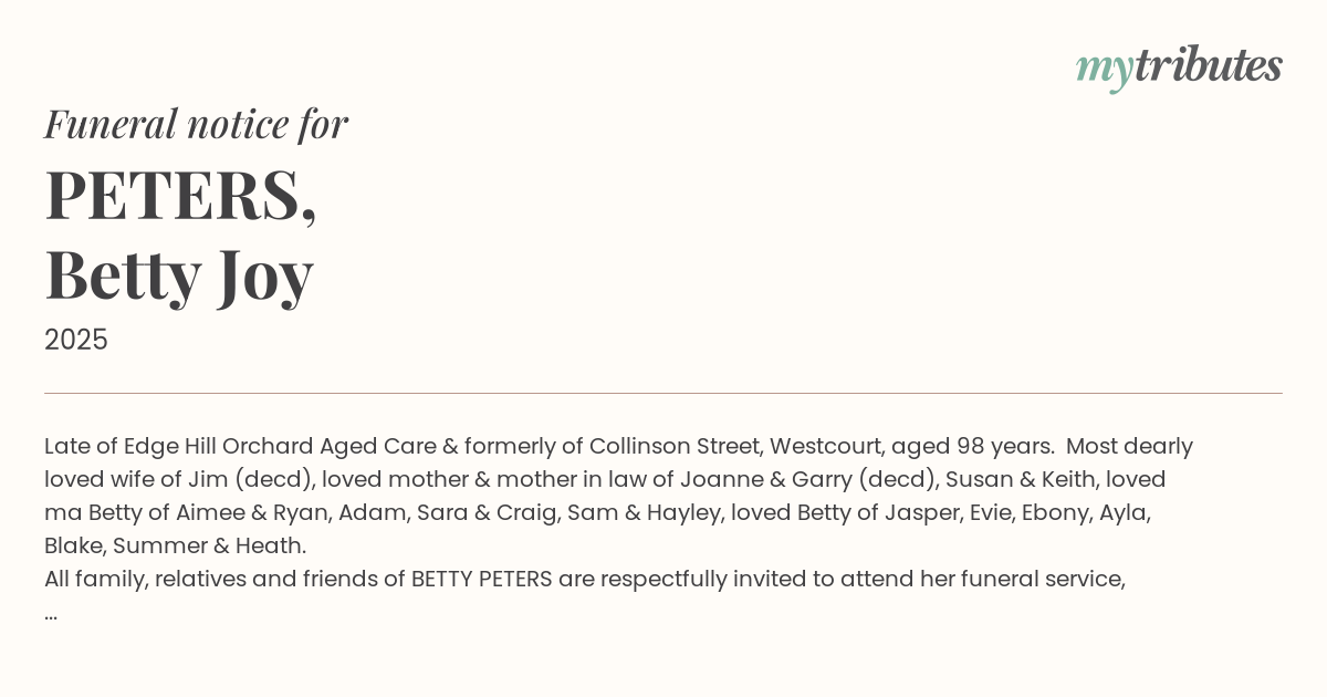 All family, relatives and friends of BETTY PETERS are respectfully invited to attend her funeral service, which will be held on MONDAY AFTERONN 5th January 2026, commencing at 1.00pm in the Chapel of Heritage Brady Funeral Directors 76 Maher Road, Gordonvale. The service will conclude at the Chapel. Betty will be privately laid to rest.