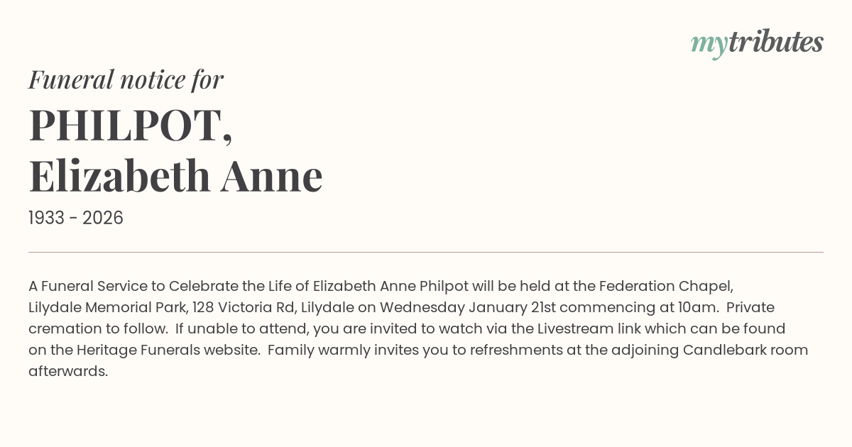 12°CA Funeral Service to Celebrate the Life of Elizabeth Anne Philpot will be held at the Federation Chapel, Lilydale Memorial Park, 128 Victoria Rd, Lilydale on Wednesday January 21st commencing at 10am. Private cremation to follow. If unable to attend, you are invited to watch via the Livestream link which can be found on the Heritage Funerals website. Family warmly invites you to refreshments at the adjoining Candlebark room afterwards.