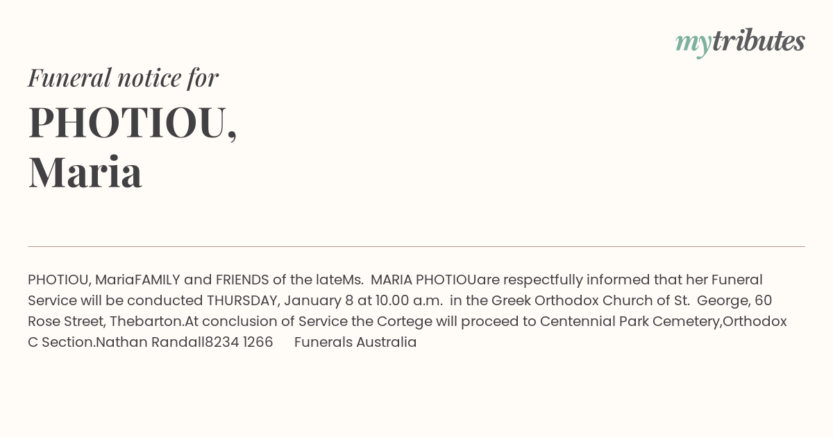 are respectfully informed that her Funeral Service will be conducted THURSDAY, January 8 at 10.00 a.m. in the Greek Orthodox