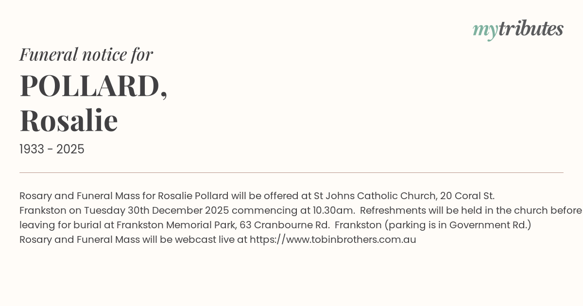 12°CRosary and Funeral Mass for Rosalie Pollard will be offered at St John’s Catholic Church, 20 Coral St. Frankston on Tuesday 30th December 2025 commencing at 10.30am. Refreshments will be held in the church before leaving for burial at Frankston Memorial Park, 63 Cranbourne Rd. Frankston (parking is in Government Rd.) Rosary and Funeral Mass will be webcast live at https://www.tobinbrothers.com.au