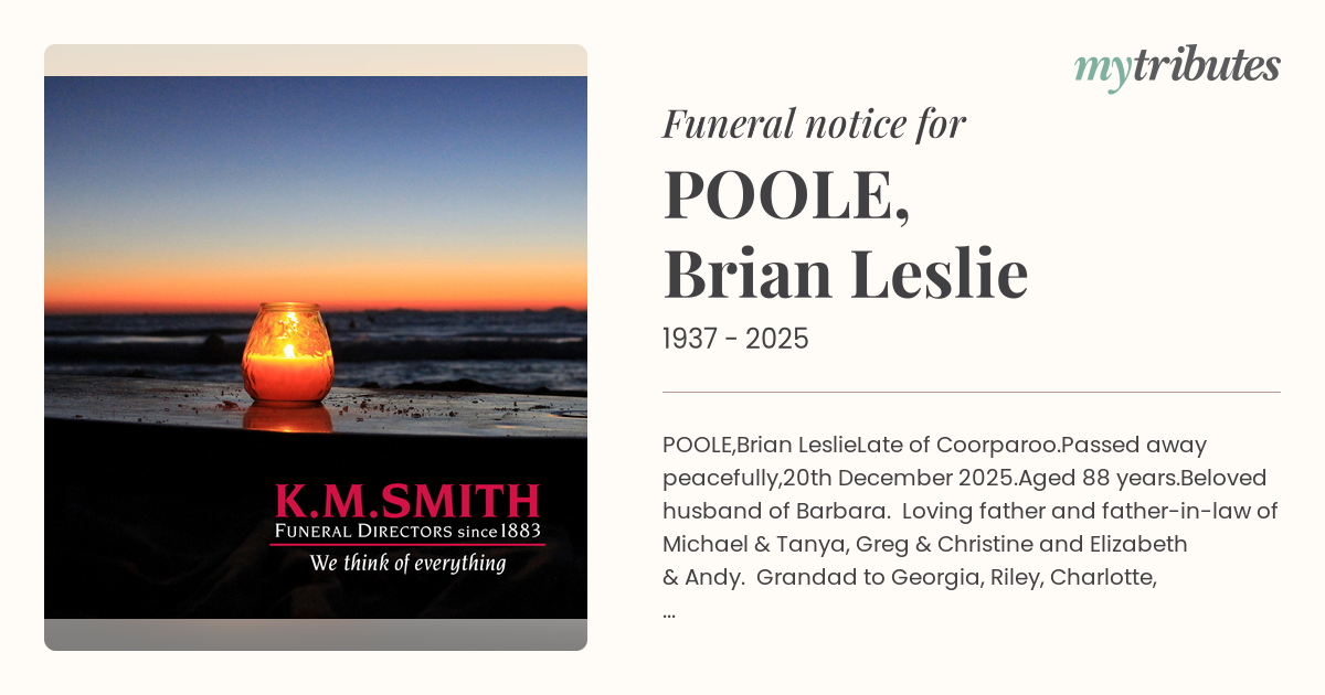 Family and friends of Brian are invited to attend Funeral Mass in Regina Caeli Catholic Church, 81 Waverley Road, Camp Hill, on Monday, 5th January 2026, at 10.00 a.m.