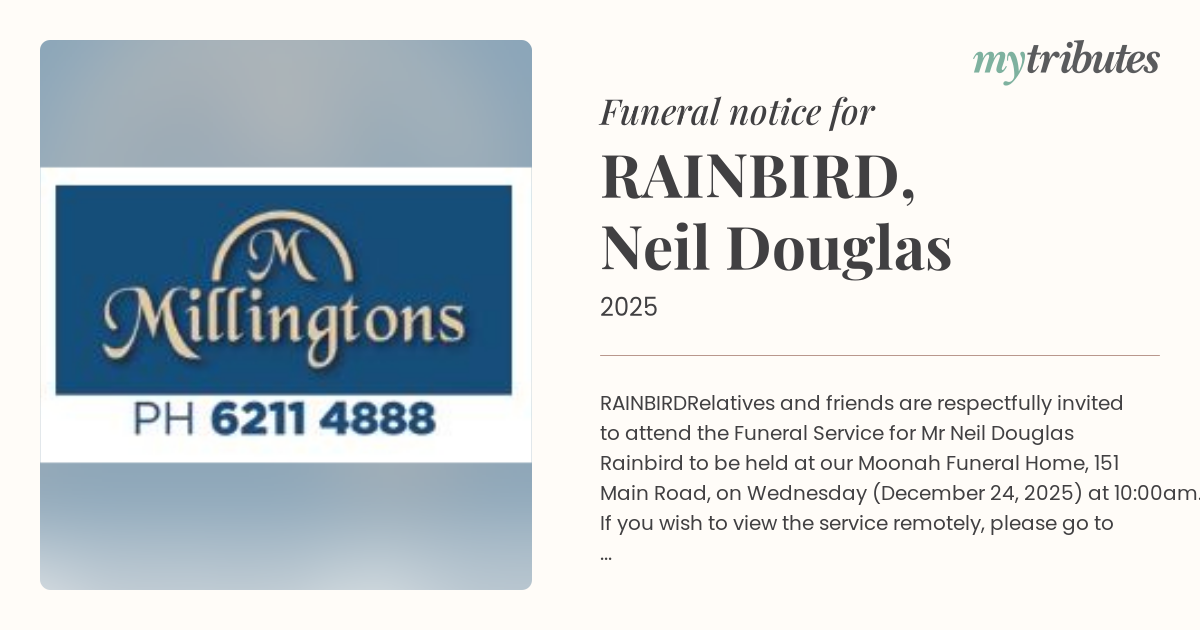 Relatives and friends are respectfully invited to attend the Funeral Service for Mr Neil Douglas Rainbird to be held at our Moonah Funeral Home, 151 Main Road, on Wednesday (December 24, 2025) at 10:00am. If you wish to view the service remotely, please go to millingtons.com.au/tributes/ click on Neil's profile, and then select the livestream link.