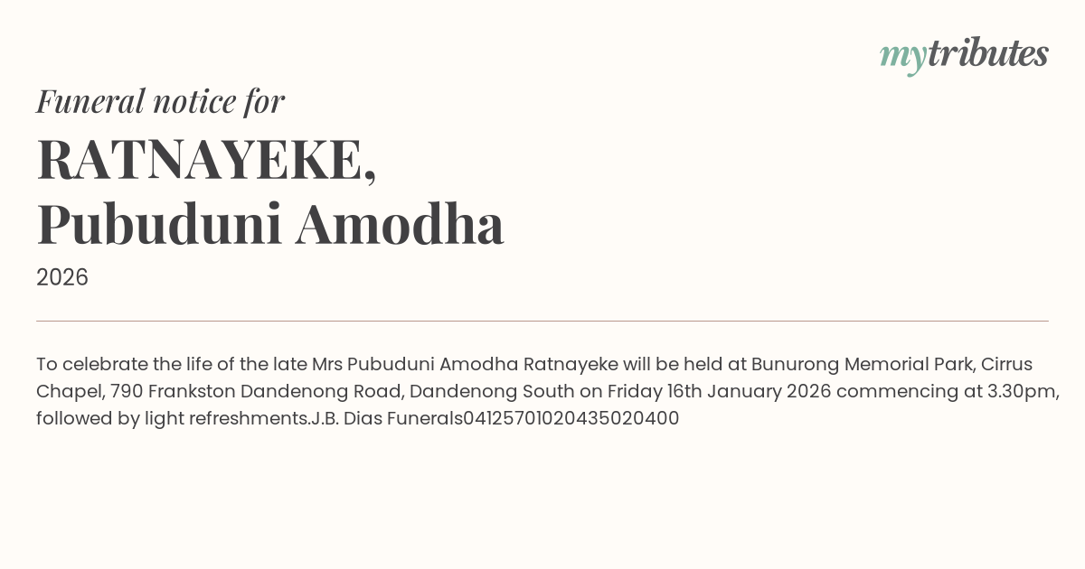 12°CTo celebrate the life of the late Mrs Pubuduni Amodha Ratnayeke will be held at Bunurong Memorial Park, Cirrus Chapel, 790 Frankston Dandenong Road, Dandenong South on Friday 16th January 2026 commencing at 3.30pm, followed by light refreshments.