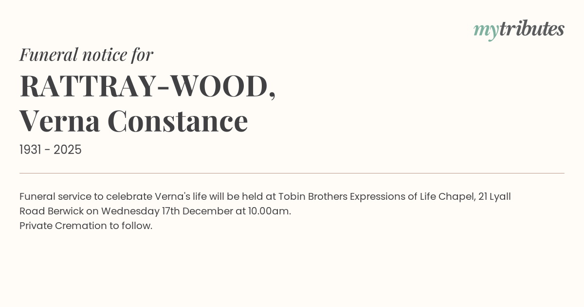 12°CFuneral service to celebrate Verna's life will be held at Tobin Brothers Expressions of Life Chapel, 21 Lyall Road Berwick on Wednesday 17th December at 10.00am.