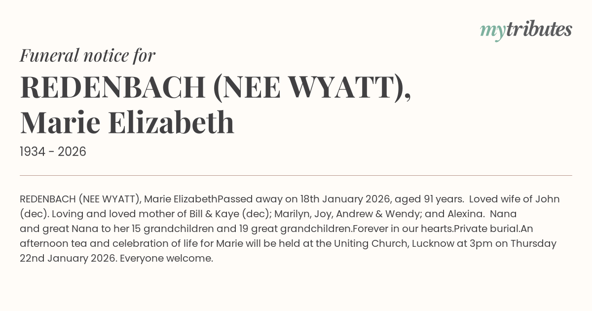 An afternoon tea and celebration of life for Marie will be held at the Uniting Church, Lucknow at 3pm on Thursday 22nd January 2026. Everyone welcome.