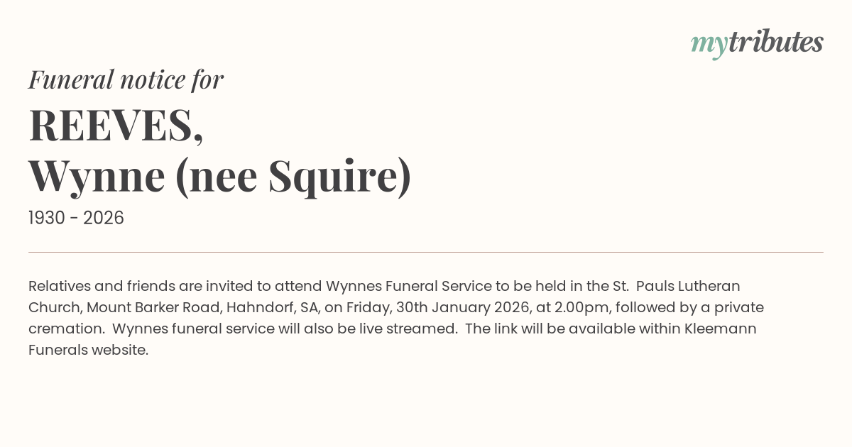 12°CRelatives and friends are invited to attend Wynne’s Funeral Service to be held in the St. Paul’s Lutheran Church, Mount Barker Road, Hahndorf, SA, on Friday, 30th January 2026, at 2.00pm, followed by a private cremation. Wynne’s funeral service will also be live streamed. The link will be available within Kleemann Funerals website.