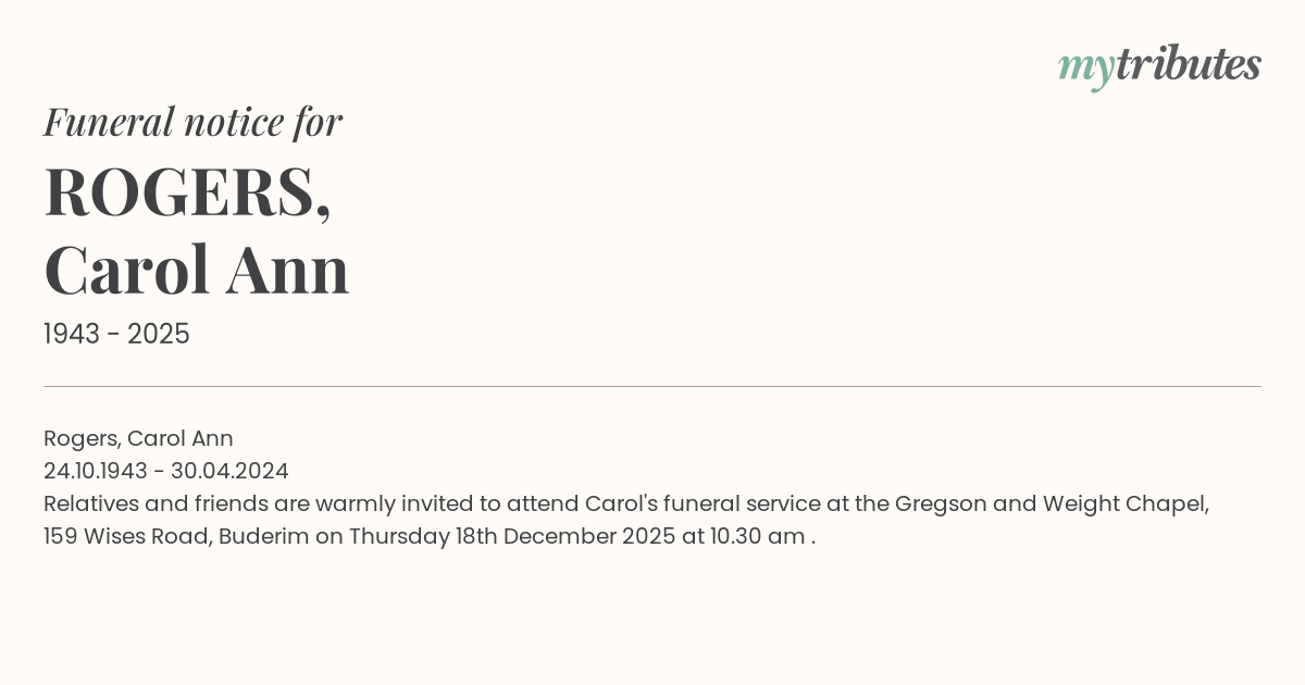 Relatives and friends are warmly invited to attend Carol's funeral service at the Gregson and Weight Chapel, 159 Wises Road, Buderim on Thursday 18th December 2025 at 10.30 am .